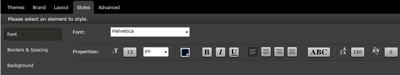 - Appearance : themes, brand, lay-out, styles and advanced settings (CSS). Basically this is to determine fonts, colors, links, backgrounds, logo, and borders & spacing (see screenshot below).