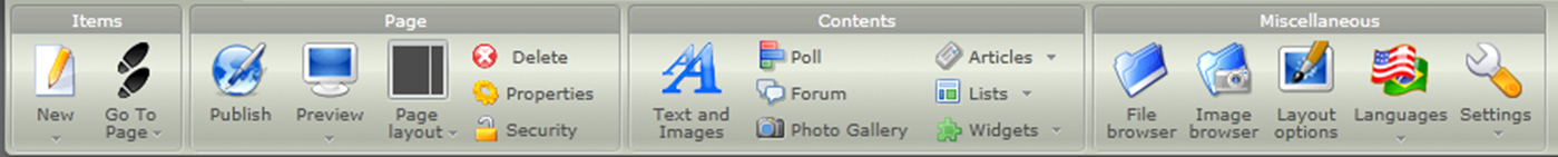 The dashboard is situated in the left top corner and comprises 4 main areas to work with : Items, Page, Contents and Miscellaneous :